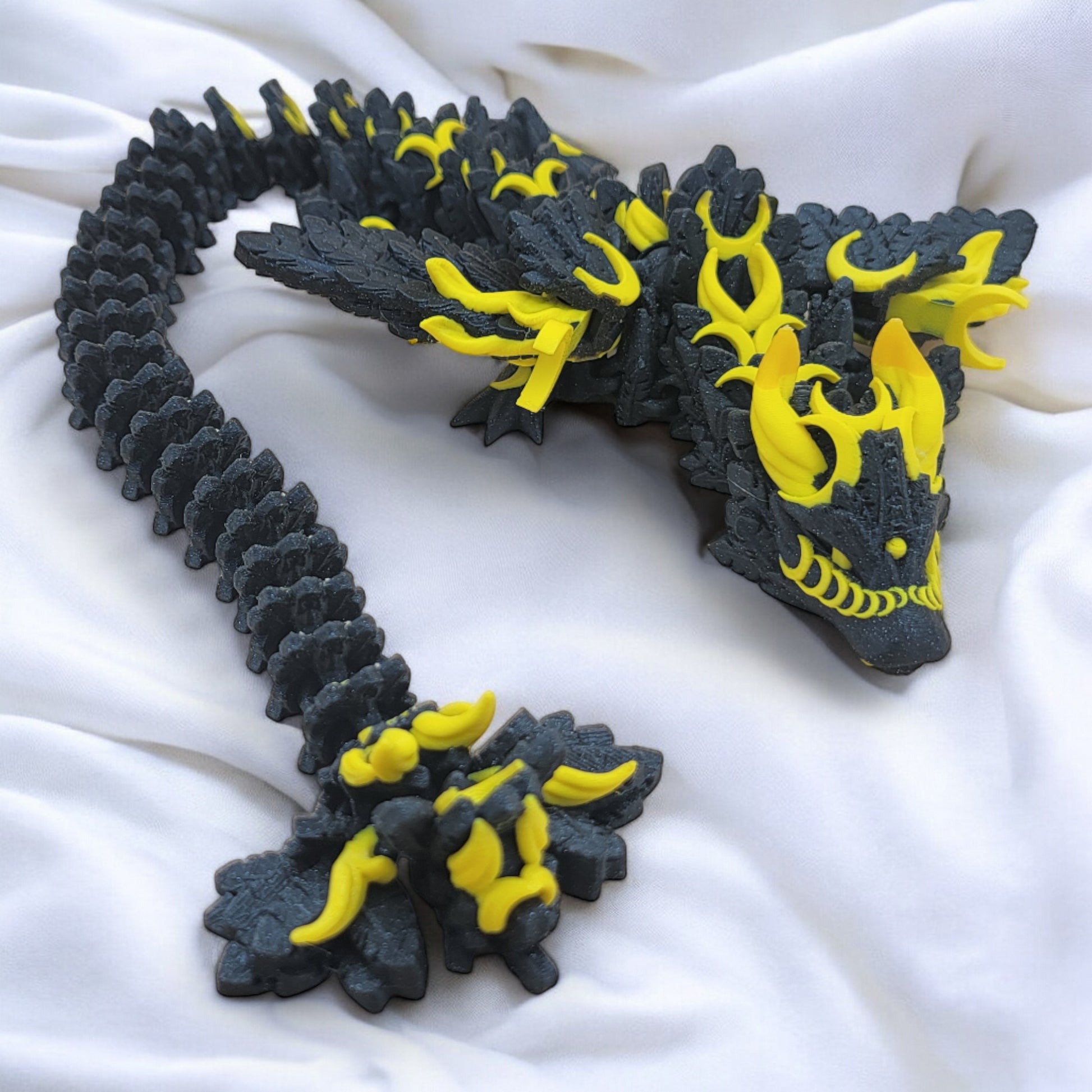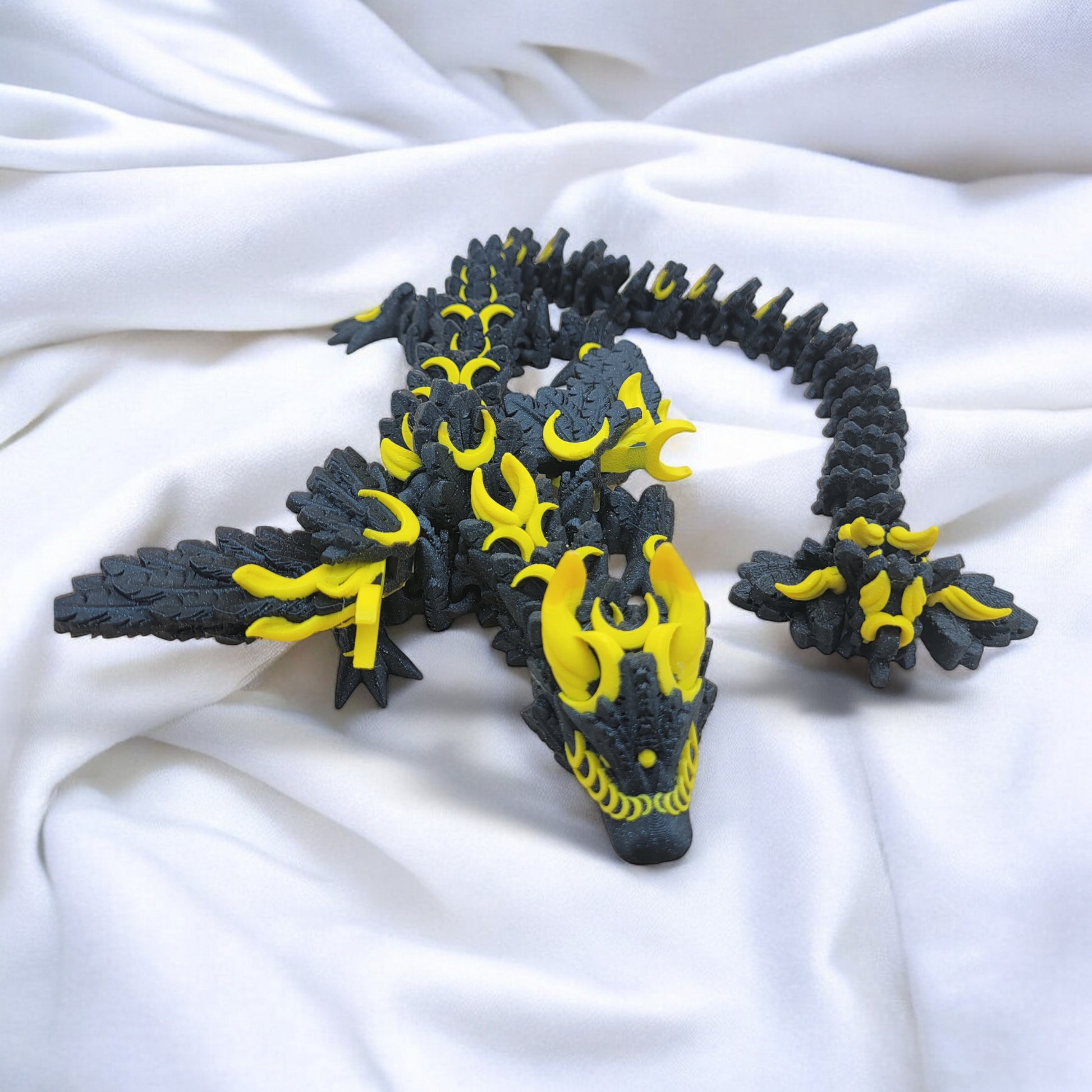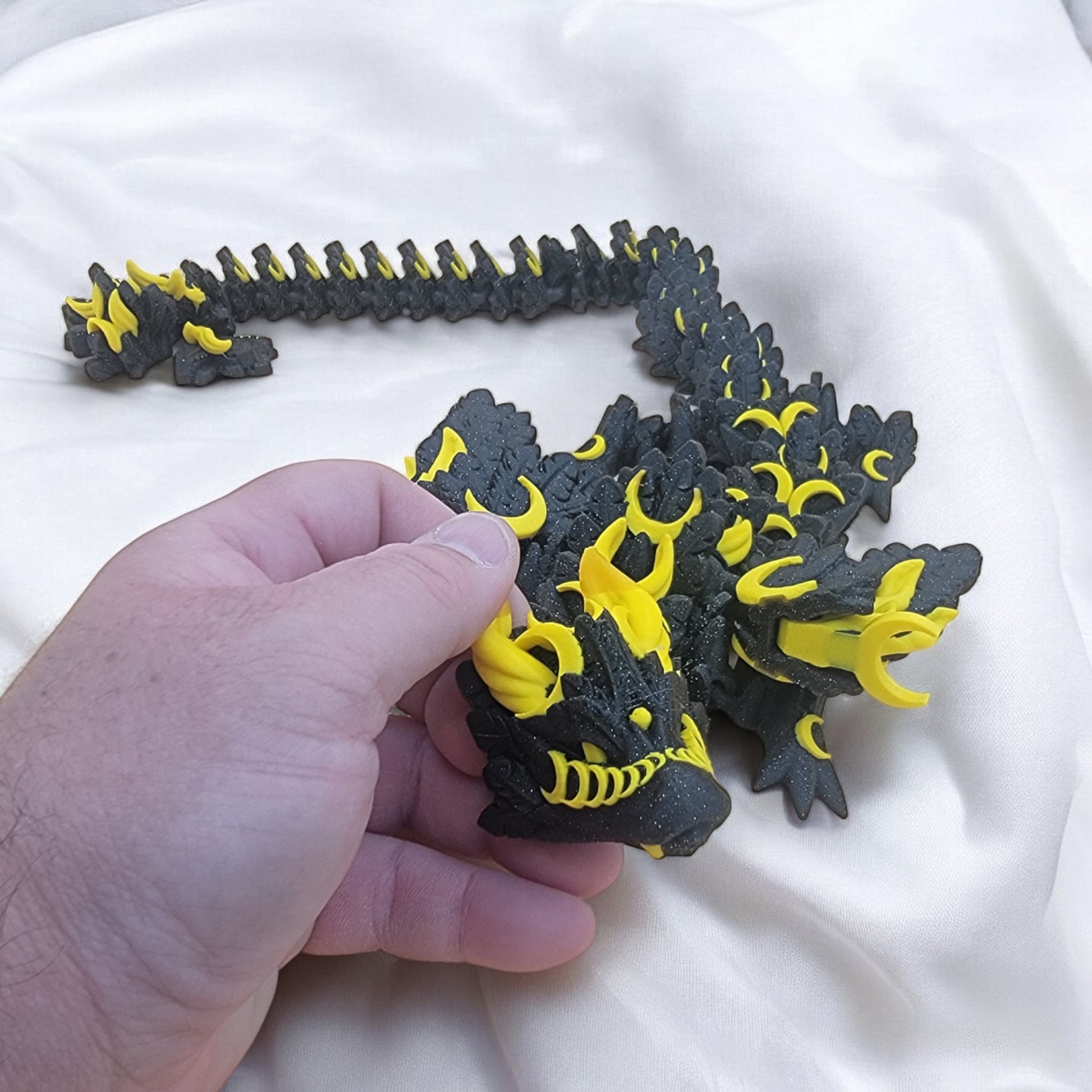 Unveil the mystical allure of the Lunarwing Dragon, a 3D-printed creation that captures the essence of the night sky. This articulated dragon features a striking black, sparkly body that shimmers like a starry night, adorned with intricate moon motifs throughout its design. The Lunarwing Dragon is perfect for those who are captivated by the mysteries of the moon and the beauty of the cosmos.