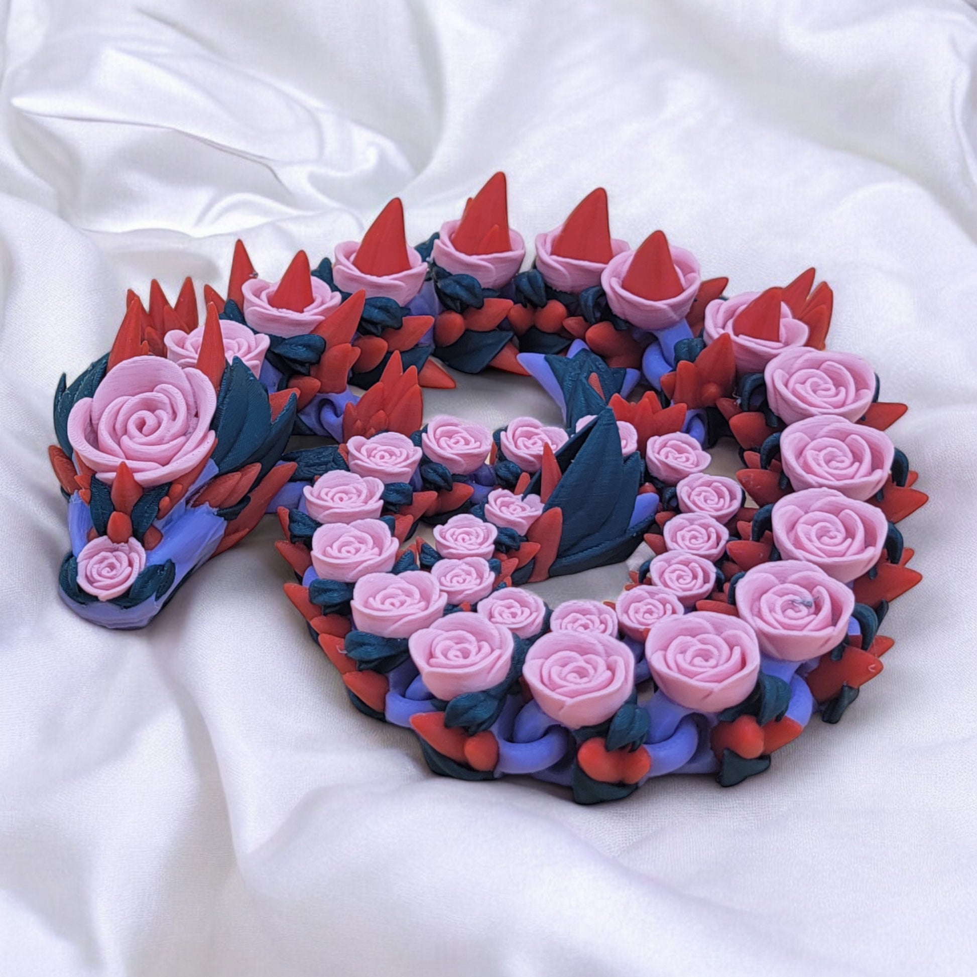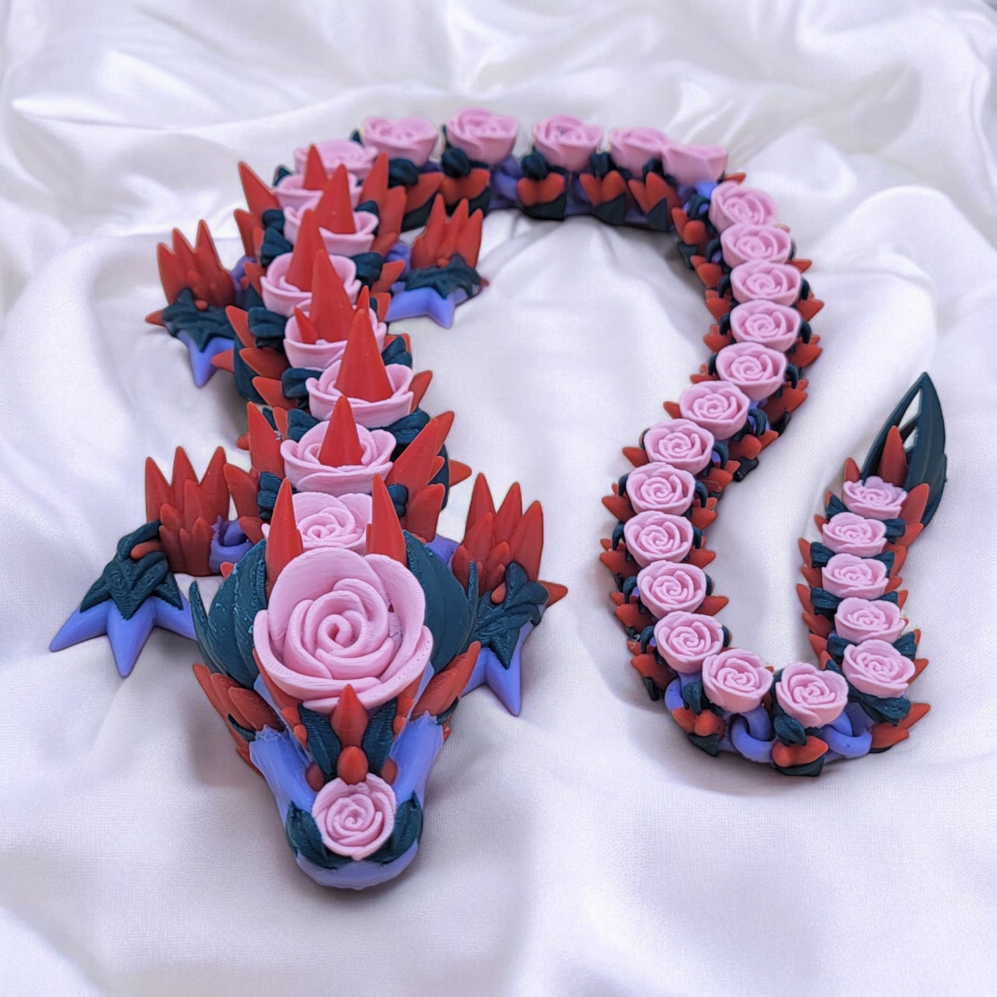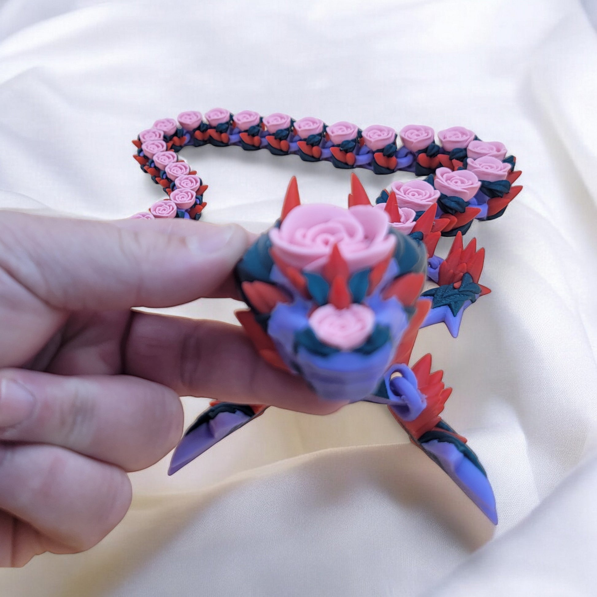 Introducing the Rose Dragon, a beautifully detailed, fully articulated dragon that embodies elegance and grace. This enchanting creature is adorned with intricately designed roses along its spine, giving it a soft and delicate appearance that contrasts with the dragon's naturally fierce form. The attention to detail in each rose, from the petals to the leaves, showcases the craftsmanship and artistry that goes into creating this unique piece.